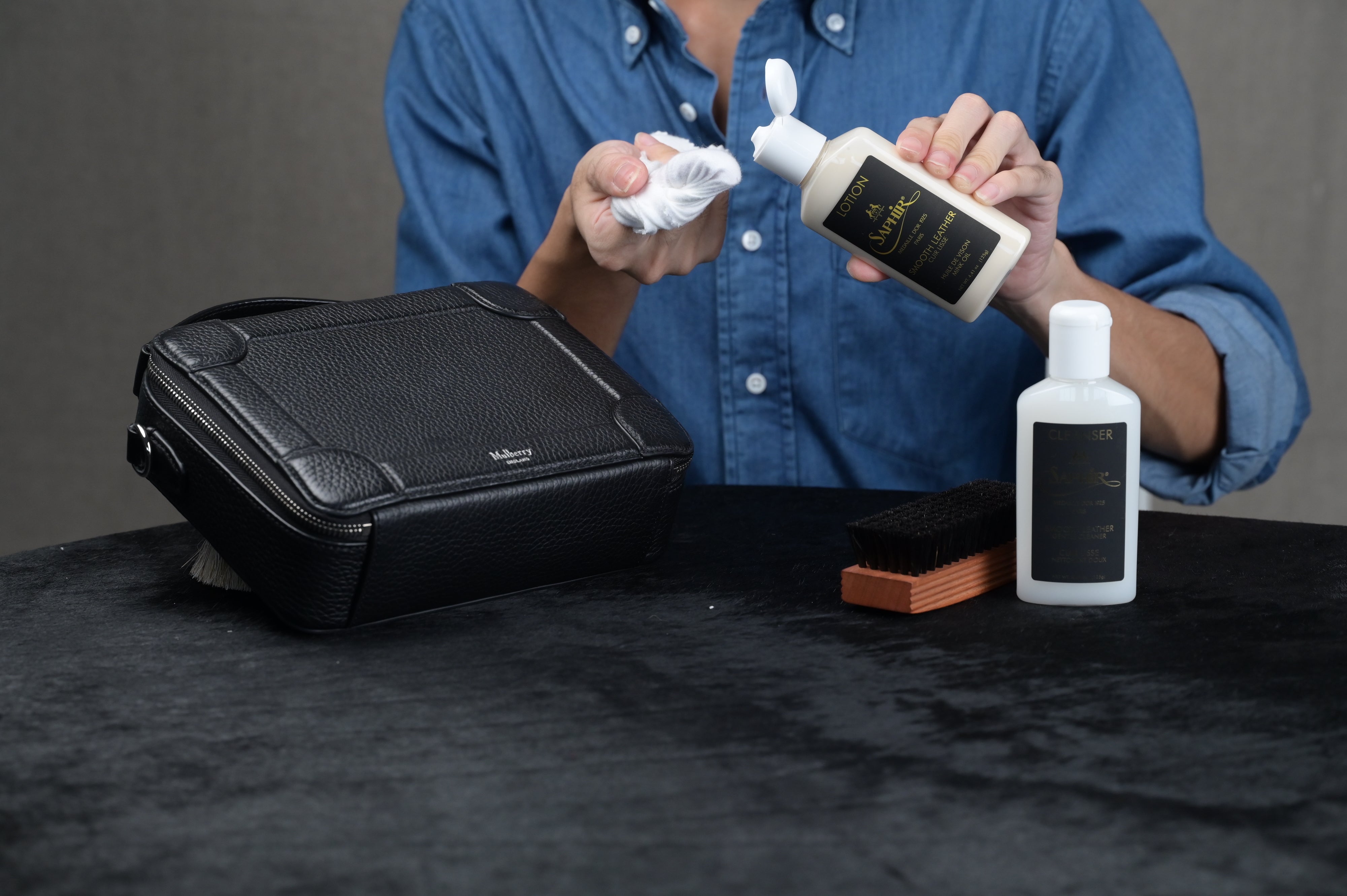 With a clean cotton cloth wrapped tightly around your first two fingers, apply a coin-sized amount of the Cleanser onto the cotton cloth. Massage the product into the leather using small circular motions. After each wipe, roll the cloth over to a clean side and repeat the application until you have wiped the entire bag.