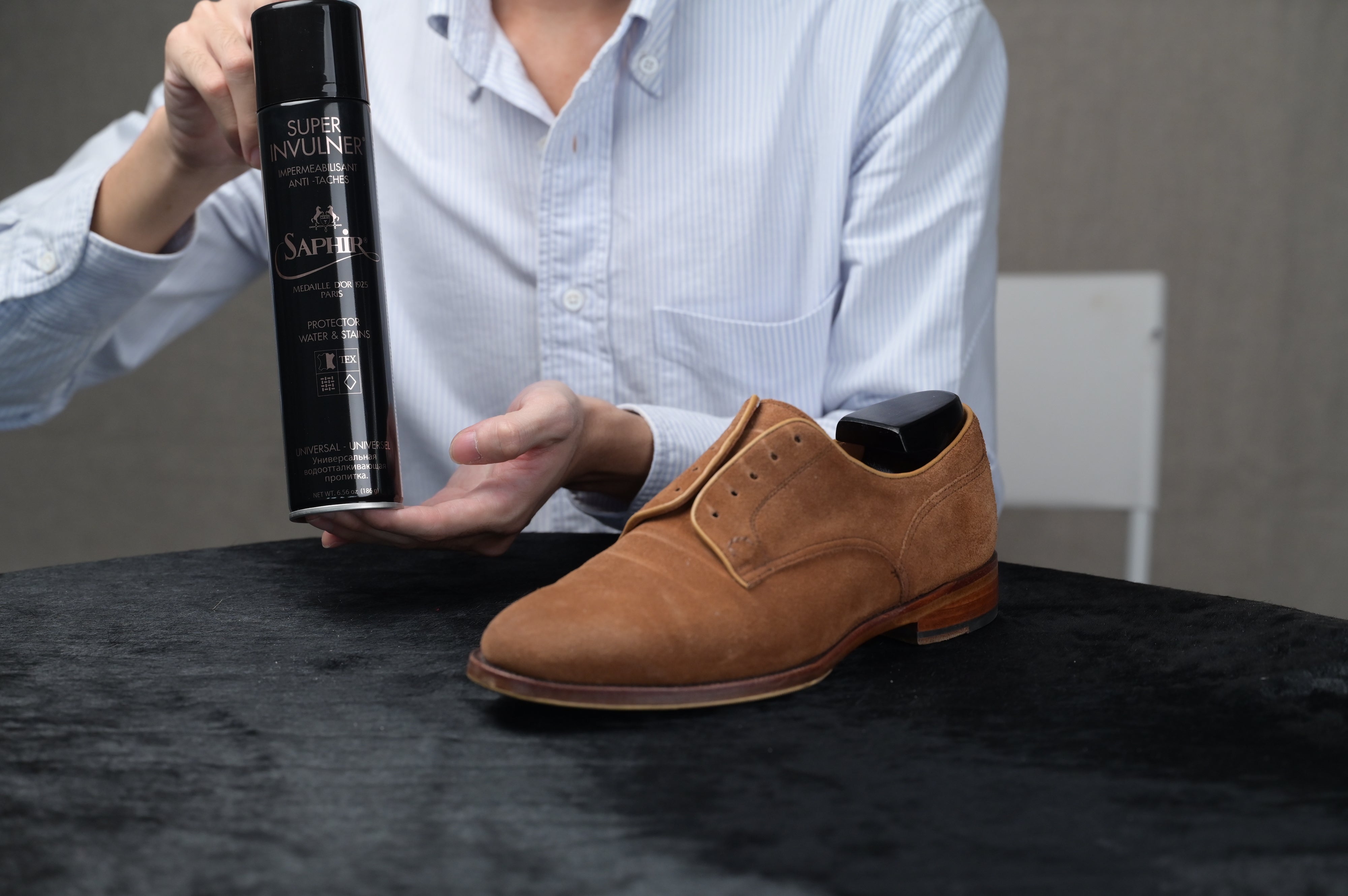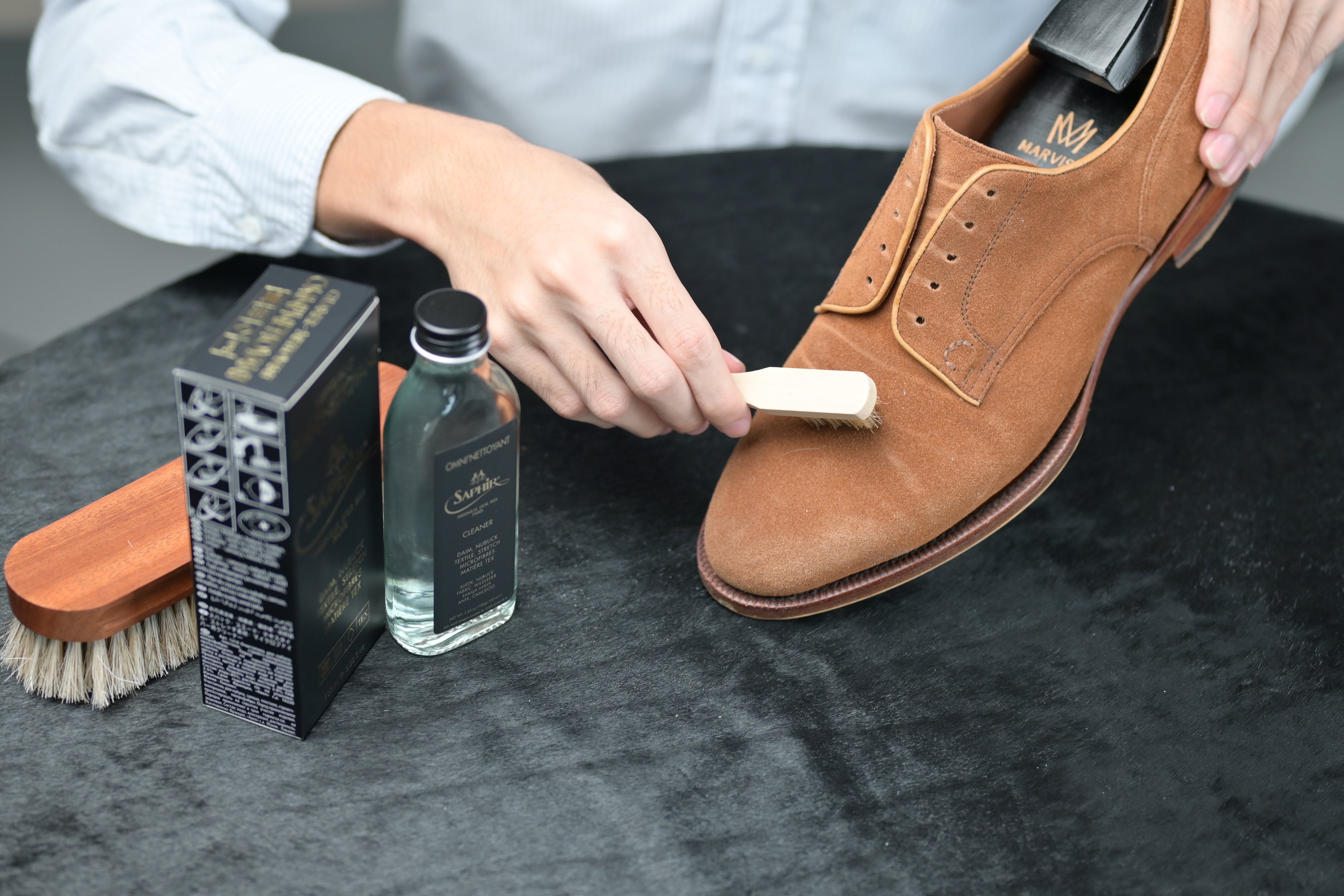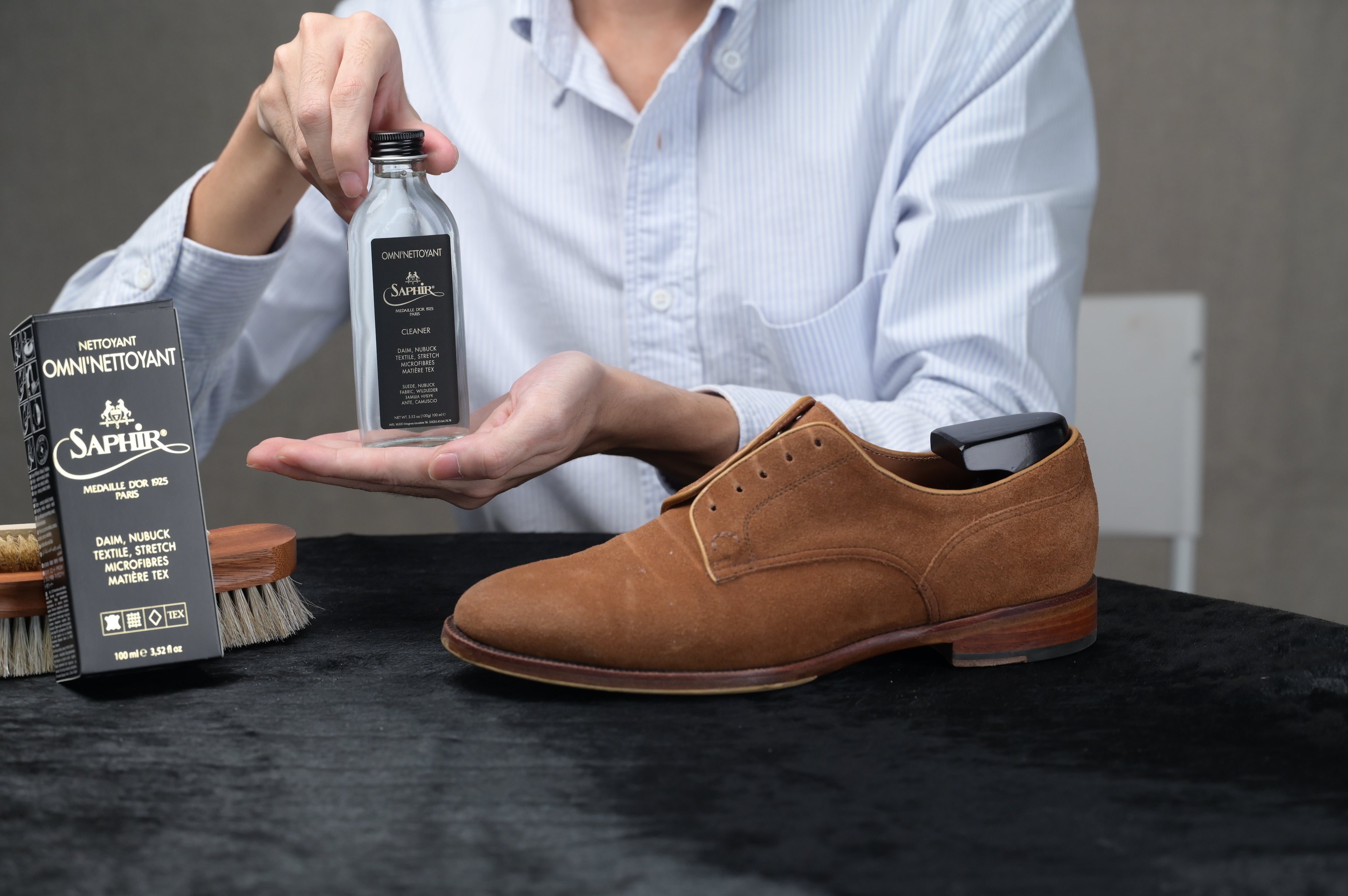 We recommend using the Saphir Médaille d’or Omni’nettoyant to thoroughly wash and clean your suede or nubuck shoes when they are very dirty.
