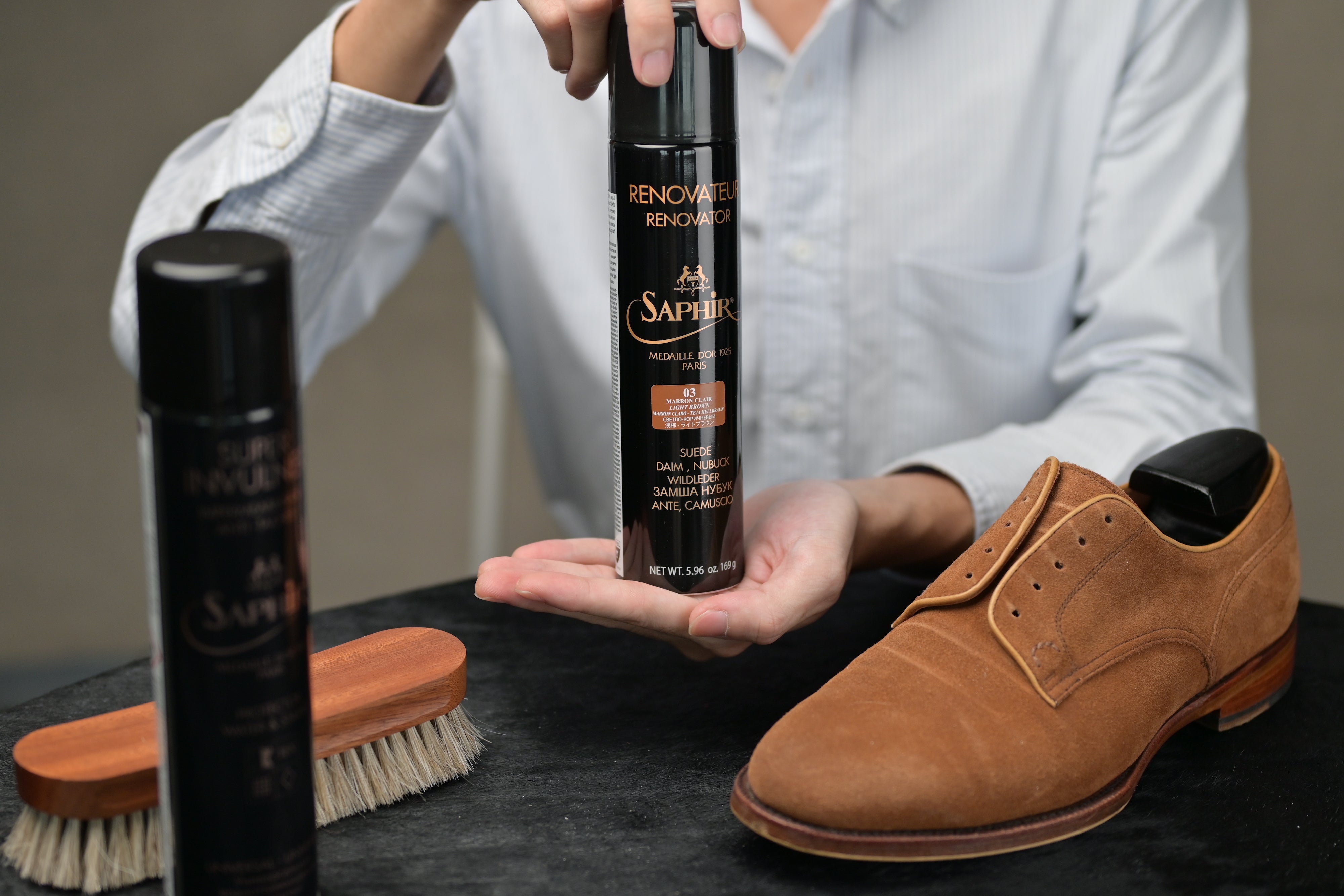 We recommend using the Saphir Médaille d’Or Suede Renovateur to nourish and recolour your suede or nubuck leather shoes especially if the colour has faded after using The Omni’Nettoyant.