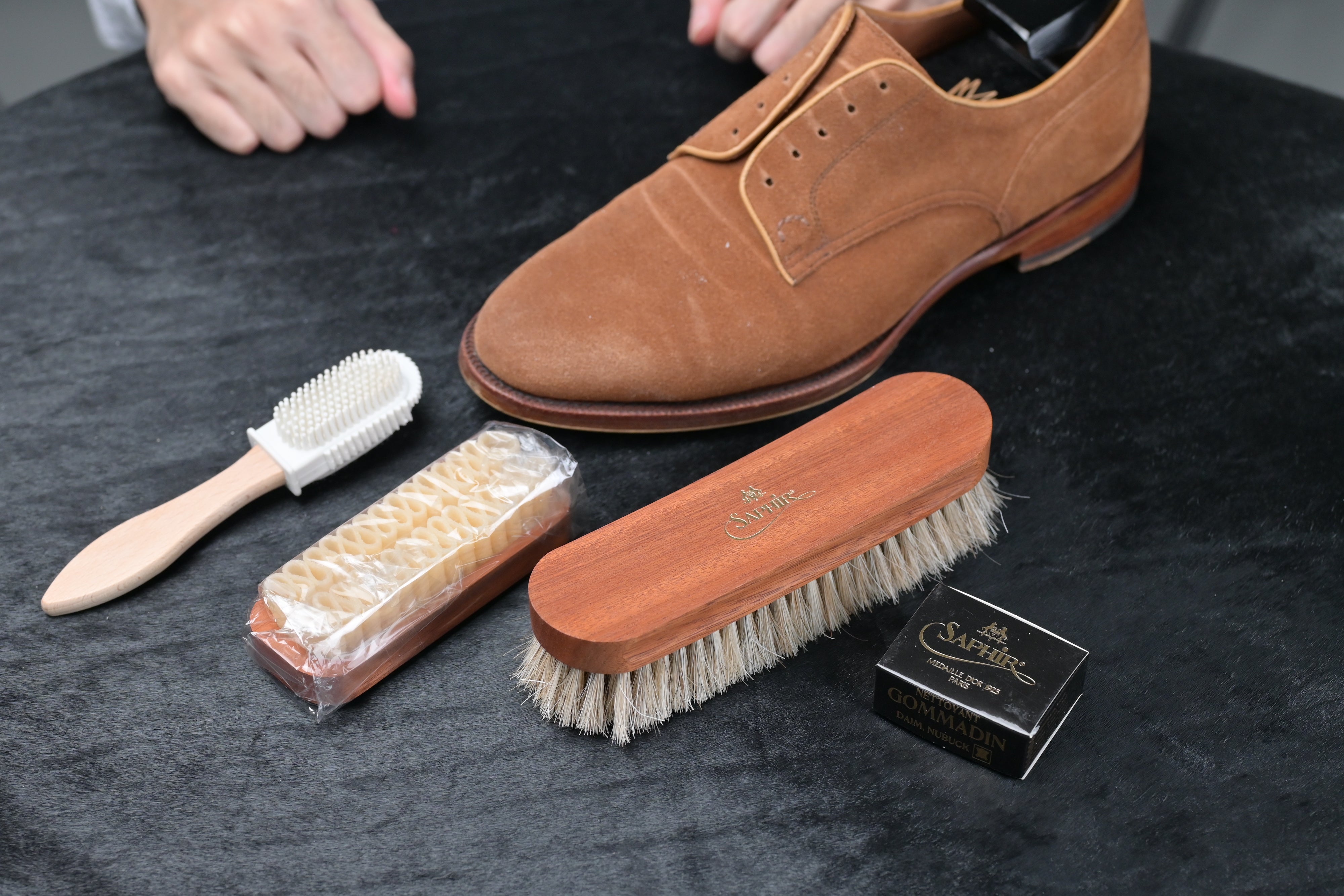 If there are any specific stains or any other stubborn stains on the shoes where the suede brush is unable to remove, proceed to use the Saphir Gommadin Eraser. Once you have identified the dried mark or stain, rub the eraser onto it like how you would do with a pencil eraser. Afterwards, brush off any residues or grime with a horsehair brush.