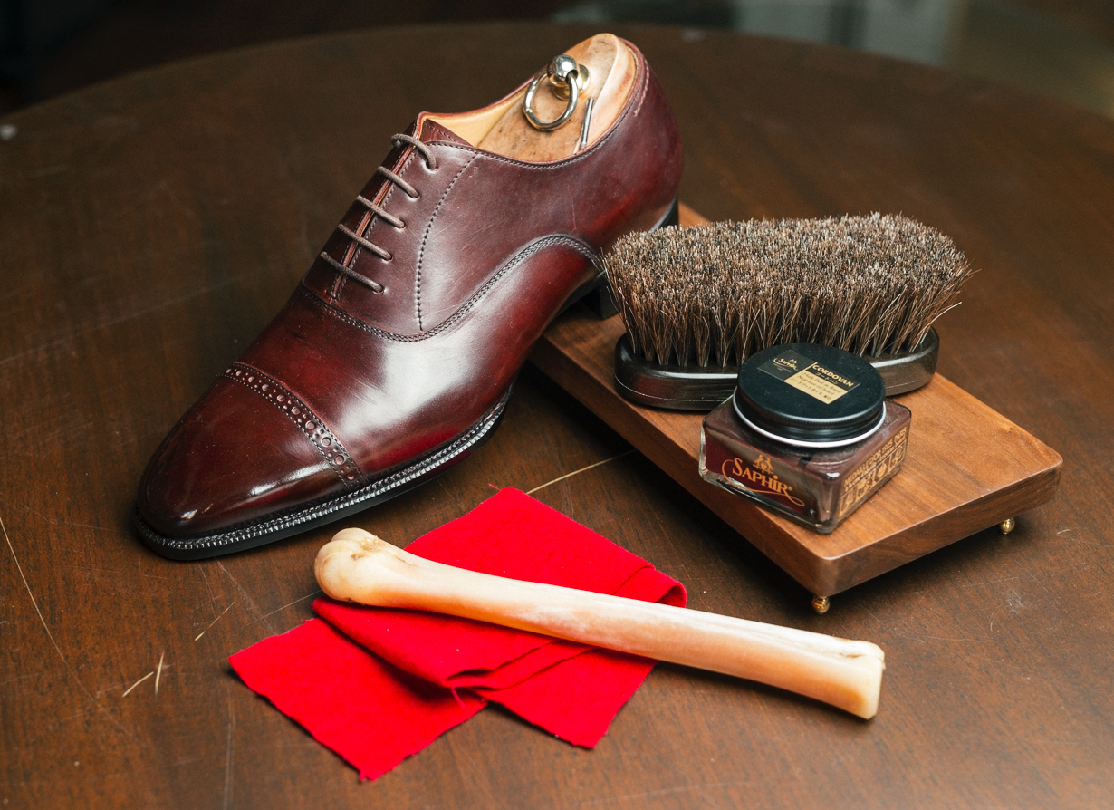 Boning is a traditional polishing method whereby wax is applied to the footwear and then brought to a high shine by vigorous rubbing with a deer bone. In doing so, you can reduce crease appearances, scratch marks, discoloration and grease up a beautiful swirls - all ready for that signature Cordovan Shine.